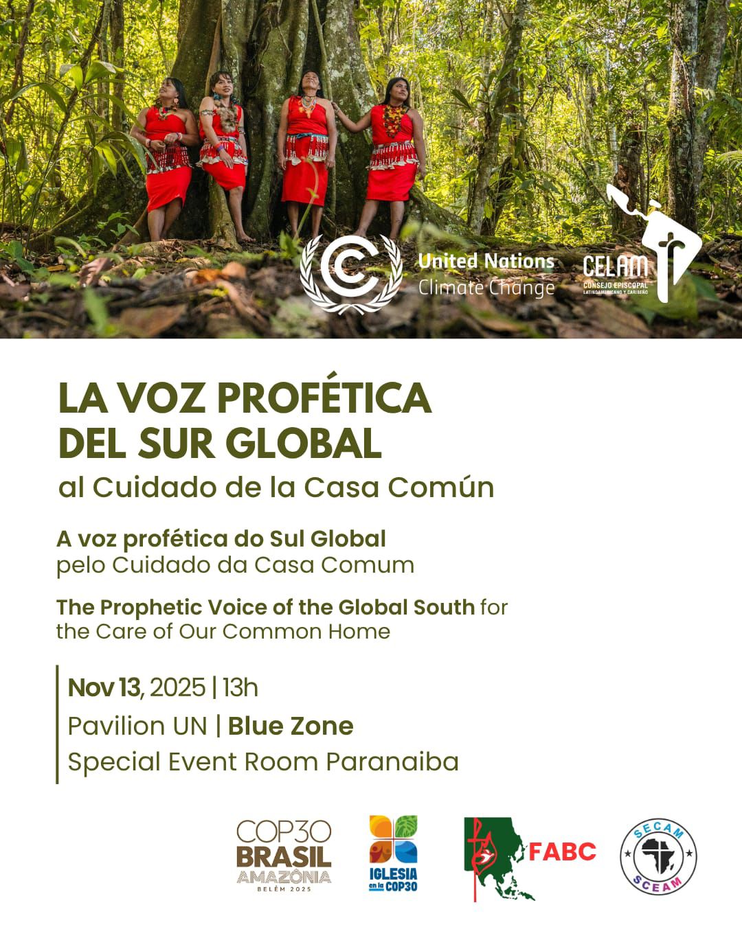 En este mismo contexto, el jueves 13 de noviembre, tendrá lugar en el Pabellón de las Naciones Unidas una mesa redonda titulada “La voz profética del Sur Global al cuidado de la casa común”, en la que participarán los cardenales Jaime Spengler (presidente del CELAM), Fridolin Ambongo (presidente del SECAM) y Felipe Neri Ferrao (presidente de la FABC), junto a Simón Stiell, secretario ejecutivo de la Convención Marco de las Naciones Unidas sobre el Cambio Climático (CMNUCC). Este encuentro simboliza la convergencia de las Iglesias del Sur Global en torno a la justicia climática, destacando que las comunidades más afectadas por la crisis ambiental son también fuente de esperanza, alternativas y liderazgo ético.